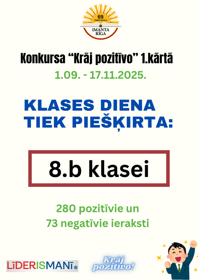 Iniciatīvas “Krāj pozitīvo!” pirmā posma rezultāti 19. novembris, 202523. novembris, 2025 Apsveicam 2.b, 4.b un 8.b klasi ar iegūto Klases dienu iniciatīvas “Krāj pozitīvo!” pirmajā posmā!