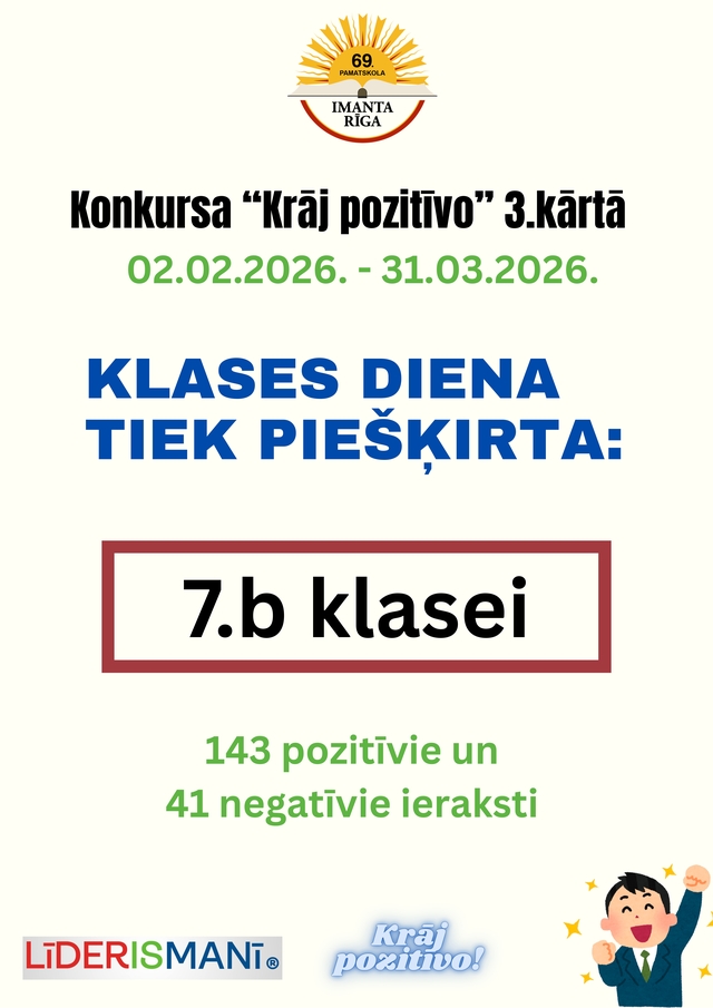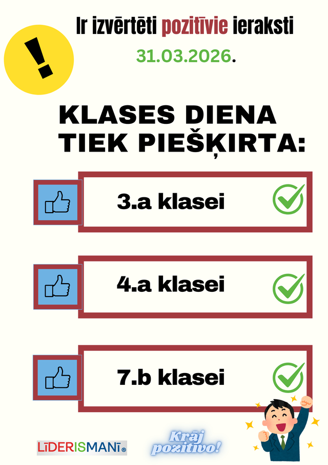 Iniciatīvas “Krāj pozitīvo!” trešā posma rezultāti 7. aprīlis, 2026 Apsveicam 3.a, 4.a un 7.b klases ar iegūto Klases dienu, sakrājot visvairāk pozitīvo ierakstu trešajā izvērtēšanas posmā!